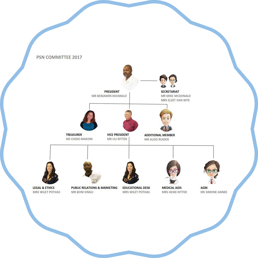 The PHARMACEUTICAL SOCIETY of NAMIBIA (PSN) is the professional body for pharmacists and pharmacy, we promote pharmacy to ensure pharmacists are recognized and trusted within the NAMIBIAN Healthcare System and wider society, as the experts in medicines governance, information and management. We make sure the voice of the pharmacy profession is heard in the development and maintenance of healthcare policy, we promote the advancement of science practice and education in pharmacy.